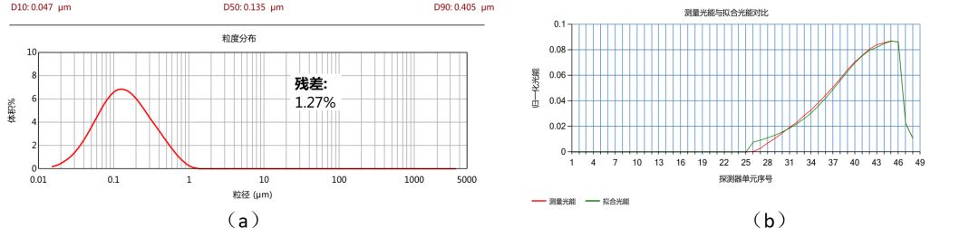 下面举一个实际测量例子。样品是一种水性石墨烯。图10(a)是用真理光学LT3600Plus仪器(采用了斜置梯形窗口技?测得的粒度分布。图10(b)是对应的实测光能分布与反演拟合的光能分布的对比。所得结果D50、D10、D90分别?.135μm?.047 μm?.405 μm,粒度分布曲线呈单峰,拟合残?.27%,数值在合理范围内、/span>