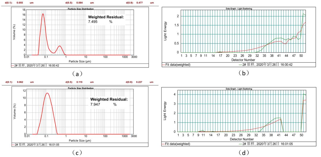 ?1是某国外仪器(采用通常的逆傅里叶变换光学系统)对上述水性石墨烯的测量结果。图11(a)?d)都是该仪器在同一次取样进行多次测量时给出来的粒度分布数据,两个结果来回跳动;?b)?d)是对应的实测光能和拟合光能分布的对比曲线。按照结?,D50、D10、D90分别?.084μm?.055μm?.477 μm;按照结?,D50、D10、D90分别?.119μm?.062 μm?.227 μm、/span>