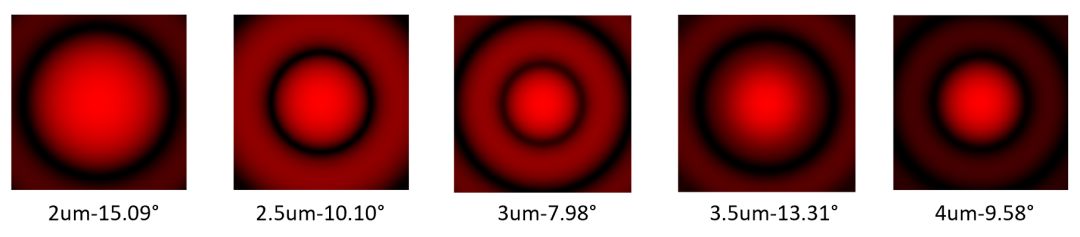 自激光粒度仪诞生直到前不久的?0年来,业内人士都不曾怀疑过这样的光散射规律: 颗粒越小,散射光的分布范围越?爱里斑越?,即散射光的分布范围随着颗粒的减小而单调增大,从而保证了颗粒大小与散射光分布之间的一一对应关系。这是激光粒度仪能够正常工作的物理基础。但是真理光学和天津大学的联合研究团队却发现,对于透明颗粒,上述规律在某些特定的粒径区间不成立,即有时会出现颗粒越小,爱里斑也越小的现象。图12是波长取0.633μm,颗粒折射率1.59,介质折射率1.33时,2?μm之间的各种颗粒的散射光斑图样。其?μm颗粒的爱里斑尺寸?.98°,?.5μm颗粒的爱里斑尺寸则是13.31°,出现了反常现象,我们称之为爱里斑的反常变化(Anomalous Change of Airy Disk,ACAD)、/span>