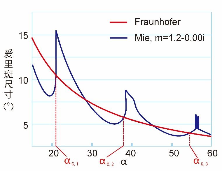 ?3是爱里斑尺寸随粒径的连续变化曲线,其中,α(= πDn0/λ,D为颗粒直径,λ为空气中照明光波长,n0为分散介质的折射?称为无因次参量,与粒径成正比。蓝色曲线是采用米氏理论计算得到的爱里斑尺寸随无因次参量变化的曲线,红色曲线则是用夫琅禾费衍射理论计算得到的爱里斑尺寸变化曲线。由于米氏理论是物理学界公认的严格理论,因此蓝色曲线的结果反映了爱里斑变化的真实情况。图中的m表示颗粒相对于分散介质的相对折射?本例中,实部?.59/1.33=1.20),其虚部?,表示颗粒是透明的。从中可以看出,爱里斑尺寸随着粒径的增大而振荡变化。虽然总体趋势是减小的,但在某些局部是增大的,我们把这样的区域称为反常区,而把反常区内蓝色曲线和红色曲线的交点称作反常区的中心,图中共?个反常区、/span>