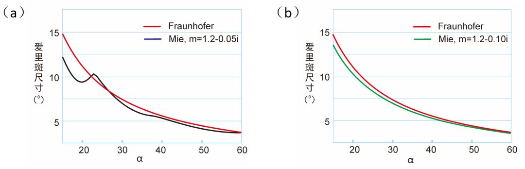 颗粒如果具有吸收性,那么随着吸收系数的增大,反常现象会逐步减弱,直至消失。在?4中,?a)表示颗粒吸收系数?.05时的爱里斑大小随无因次参量的变化曲线,可以看出,曲线的振荡幅度显著减小;?b)表示颗粒吸收系数?.10时,曲线的振荡完全消失、/span>