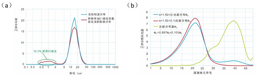 下面用一个数值模拟的例子进行说明。图18(a)中的蓝色曲线是事先设定的一种颗粒样品的粒度分布。假设颗粒透明,折射率?.50,处在水介质中。它对应的散射光能分布如?b)中的蓝色曲线所示。假如给颗粒加上一?.1的吸收系数,那么该颗粒样品产生的散射光能分布如图(b)中的红色曲线所示。蓝、红两种曲线相比,蓝色曲线在35?5单元之间鼓起一个小峰,这个小峰等效于一定比例的绿色曲线,也可视为某种粒度分布对应的散射光能分布。图18(b)中三种曲线或散射光能分布用公式可表达丹/span>