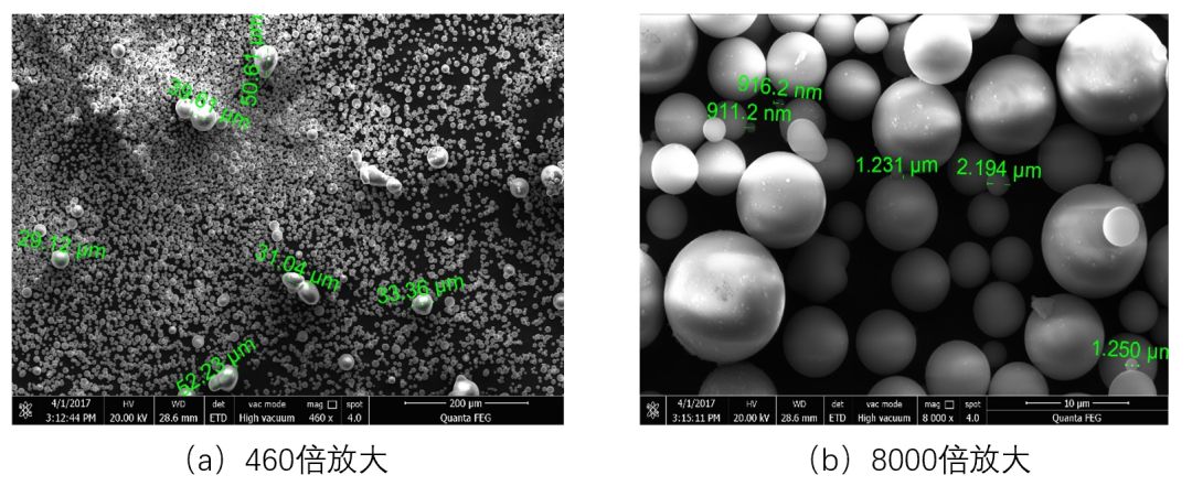 ?0是一种人为配制出来的三个峰的二氧化硅样品。用国外仪器测量时,如果取“通用模式”,则结果如?a)所示,只有一个峰;如果取“多峰窄分布模式”,则在主峰的右?大颗粒侧)出现一个小峰。该样品用真理光学LT3600测量时,共有3个峰:在主峰的左右各有一个小峰,左侧的小峰在1?μm之间。图21是该样品的电镜照片。从?a)460倍放大照片看,确实存?0μm左右的大颗粒;从?b)8000倍放大照片看,也存在1μm?μm颗粒。可??μm的颗粒是真实存在的,而国外仪器没有测到这些颗粒、/span>