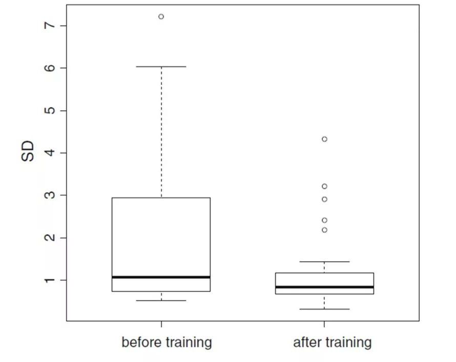 Fig. 2SDs for ten samplings for each participant before and after training for pipetting technique. Boxes represent the first and third quartiles, and the bold horizontal line inside the box represents the median. Whiskers are for upper and lower boundaries of the 1.5 interquartile range (IQR), and outliers are shown as circles