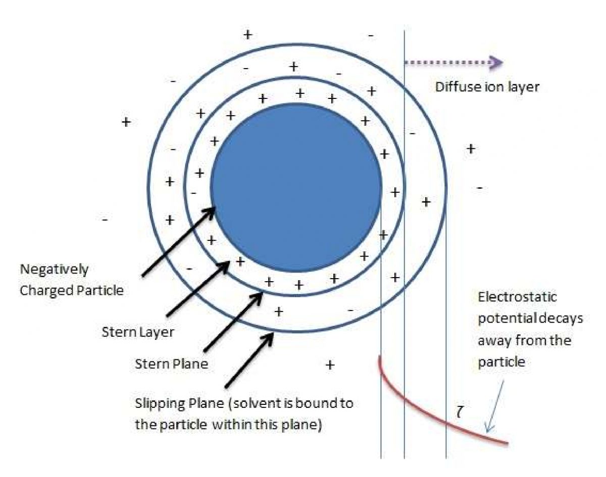 由于分散粒子表面带有电荷而吸引周围的反号离子,这些反号离子在两相界面呈扩散状态分布而形成扩散双电层。根据Stern双电层理论可将双电层分为两部分,即Stern层和扩散层。Stern层定义为吸附在电极表面的一层离?IHP or OHP)电荷中心组成的一个平面层,此平面层相对远离界面的流体中的某点的电位称为Stern电位。稳定层(Stationary layer) (包括Stern层和滑动面slipping plane以内的部分扩散层) 与扩散层内分散介?dispersion medium)发生相对移动时的界面是滑动面(slipping plane),该处对远离界面的流体中的某点的电位称为Zeta电位或电动电?ζ-电位)、/p>