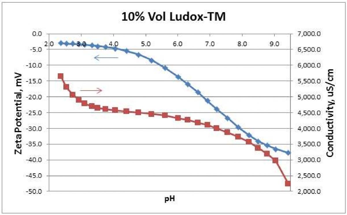 电位滴定法可用于测定样品的等电点。如上所述,IEP可能是可取的或者相反。电位滴定图可以显示Zeta电位与pH值之间的关系变化。这样的测量使制造商通过酸或碱的使用,优化产品的运输和储存。图2显示在Ludox TM二氧化硅样品上自动添?N HCl时,Zeta电位及电导率的变化。该过程是由美国MAS公司生产的超声电声法粒度及Zeta电位分析仪Zeta-APS设备完成的。图2显示,在pH?时,Zeta曲线接近一个稳定区域,而电导率增加得更快。这表明,随着pH值的降低,二氧化硅颗粒逐渐被H+离子饱和。当更多的H+离子停留在连续的水溶剂中时,电导率增加得更快,而不是通过滑面向颗粒表面扩散、/p>