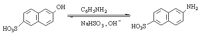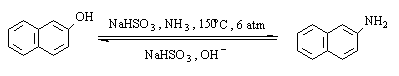 反应概述9br/>萘酚及其衍生物在亚硫酸或亚硫酸氢盐存在下和氨进行高温反应,可得萘胺衍生物,反应是可逆的、/span>