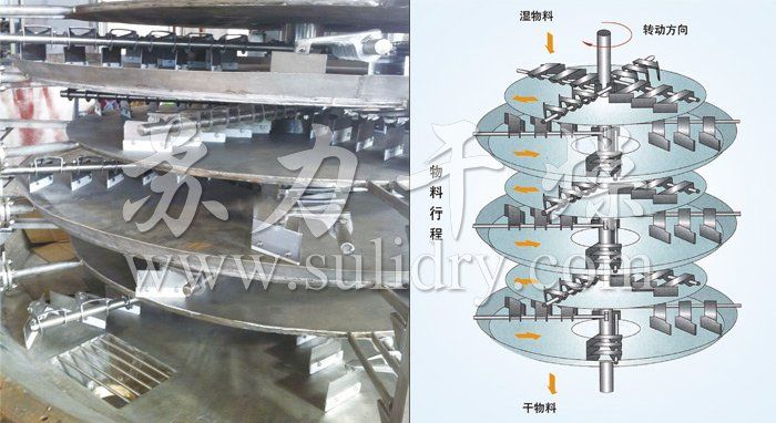 湿物料自加料器连续地加到干燥器上部第×层干燥盘上,带有耙叶的耙臂作回转运动使耙臂作回转运动使耙叶连续地翻抄物料。物料沿指数螺旋线流过干燥盘表面,在小干燥盘上的物料被移送到外缘,并在外缘落到下方的大干燥盘外缘,在大干盘上物料向里移动并从中间落料口落如下一层小干燥盘中。大小干燥盘上下交替排列,物料得以连续地流过整个干燥器。中空的干燥盘内通入加热介质,加热介质形式有饱和蒸汽、热水和导热油,加热介质由干燥盘的一端进入,从另一端导出。已干物料从^后一层干燥盘落到壳体的底层,^后被耙叶移送到出料口排出。湿份从物料中逸出,由设在顶盖上的排湿口排出,真空型盘式干燥器的湿气由设在顶盖上的真空泵口排出。从底层排出的干物料可直接包装。通过配加翅片加热器、溶剂回收冷凝器、袋式除尘器、干料返混机构、引风机等辅机,可提高其干燥的生产能力,干燥膏糊状和热敏性物 料,可方便地回收溶剂,并能进行热解和反应操作、/span>