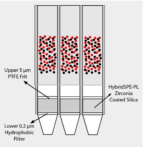 HybridSPE-磷脂 96 孔版本和 HybridSPE-磷脂 Ultra cartridge 有“孔内”和“孔内”沉淀法可供选择,其中生物血?血清首先加入孔内或筒内,然后加入酸化乙?沉淀?。短暂混?涡旋后,抽真空。由 96 孔和 Ultra 筒式过滤器含有一系列低孔隙率疏水过滤?筛板,填充床过滤?筛板组件作为深层过滤器,便于在提取过程中同时去除磷脂和沉淀蛋白。标 HybridSPE-磷脂小柱需要“离线”沉淀法、/p>