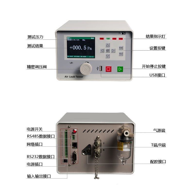 发生原理9/strong> 气密检测仪采用高精度的电子压力传感器,按要求提供稳定的检测气源,然后通过检测仪充气到被测产品上,当内部压力达到检测压力后,气体经过短时间的稳定后进入检测阶段。没有泄漏时检测压力基本保持不变,存在泄漏时工件内的气体压力随着气体从被测产品中泄漏而逐步下降,压力传感器实时输出相应的压力变化,进而按照预先设置的参数,系统自动判断是否泄漏,检测过程完全消除了人为因素的影响、/span>