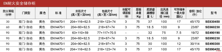 1.柜体采用高强度的钢板制作,表面静电喷涂耐腐蚀的橘纹塑粉;柜体隔层内为多层防火隔热材料,以达到防火的目的、/p> 2.正常使用时,柜门可手动打开或关闭,柜门带有阻尼器,调节开关门力的大小;当环境温度达到122℉(50℃),内置的熔丝会断开,敞 开的柜门会自动关闭,以保护柜内物品、/p> 3.当环境温度达?58℉(70℃),通风系统中的通风孔挡板会自动关闭;通风系统可外接排气管道或者空气过滤器、/p> 4.在火灾发生时,门缝及所有连接处备有的特殊感热材料会自动膨胀填满缝隙,以保证柜体内部处于密封状态、/p> 5.每扇门上有独立的圆柱锁;门上的反光警告标签符合ISO 3864规定,在低能见度及电筒照射下都十分醒目、/p> 6.可拆卸的底部盛漏槽,与带孔的嵌件配合使用,即可盛接柜内的漏液,又可避免孔嵌件上的物品浸泡在漏夜中、/p> 7.标配3块可调钢制层板,每隔可调间距32mm,层板承重能力为75KG。层板翻边高30mm,可防止小型容器意外滑落、/p> 8.柜体底部设有可调的调平支脚,即使在不平整表面也能使柜体保持平衡、/p> 9.设有静电接地传导端口,方便连接静电接地导线、/p> 10.所有耐火柜符合EN、OSHA和NFPA30标准;其中SE860230、SE830450和SE890450通过T?V独立耐火测试并获得T?V认证、/p> 11.可选配专用挂锁,实现双人双锁管理,符合中国《危险化学品安全管理条例》的规定、/p>
