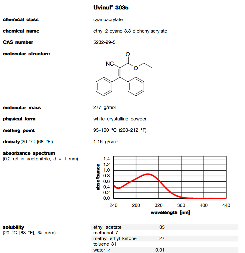 UV-3035可用于涂料的顶涂层中,以提高其耐光性?035在MEK中溶解性好,巴斯夫自己试验时系先制?0%溶液,而MEK与丙烯酸树脂相容性好,其它对巴斯夫紫外线吸收剂UV3035溶解性良好的溶剂包括醋酸乙酯和甲苯。建议客户应先测试其树脂与溶剂的相容性、br/>