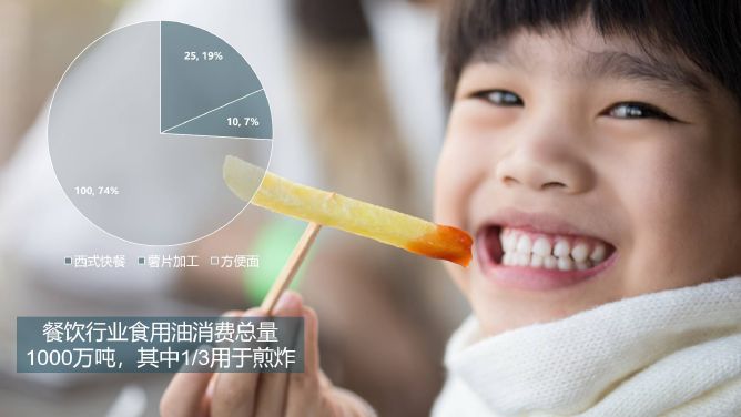 根据2016年的数据统计,餐饮行业食用油的消费总量已达到了1000万吨,其中有1/3食用油被用来煎炸,尤其被使用在西式快餐、薯片、方便面加工这几个行业、/span>