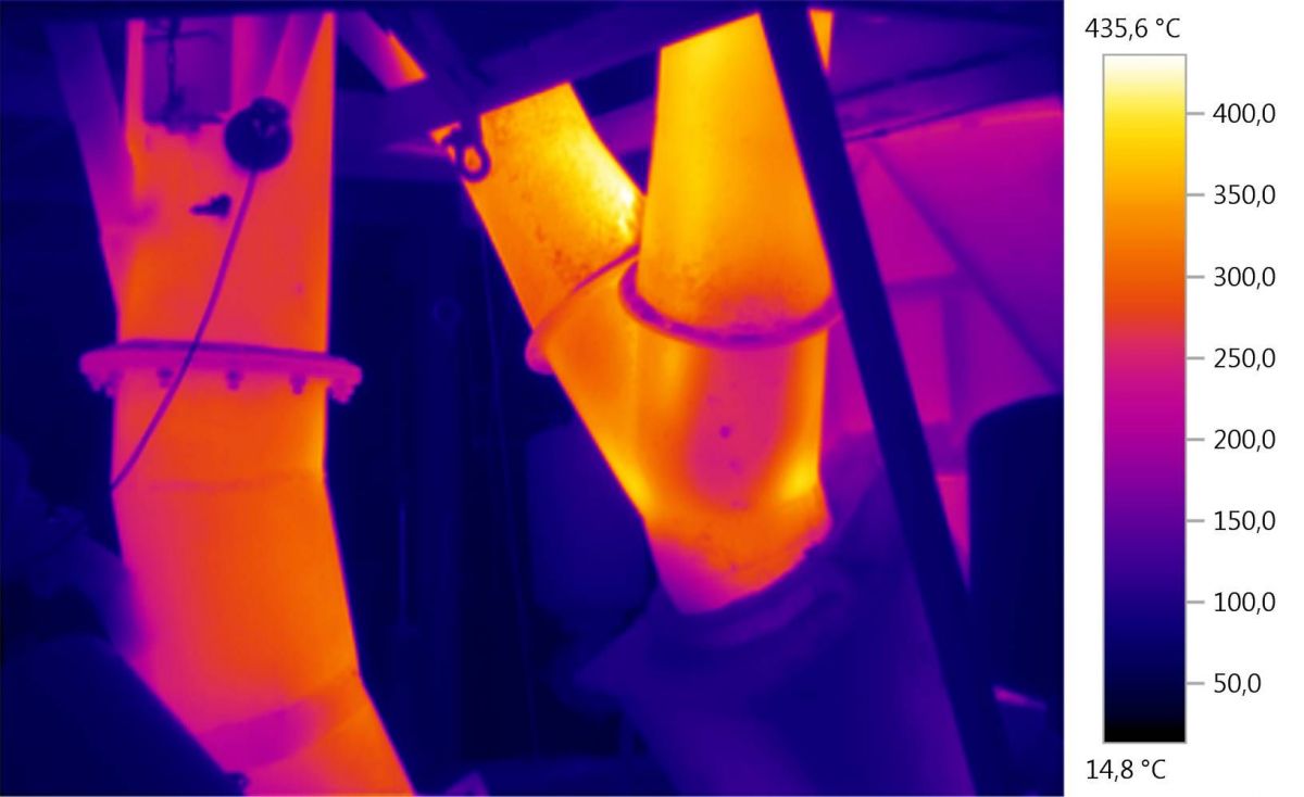Testo 热像仪可用于高温场景的测量需求。通过选配的高温测量模块,测量范围可灵活扩展至1200 ℃。通过选择调色板的高温铁红色颜色模式或特殊直方图调节实现,可实现显示屏上的高对比度显示、/span>