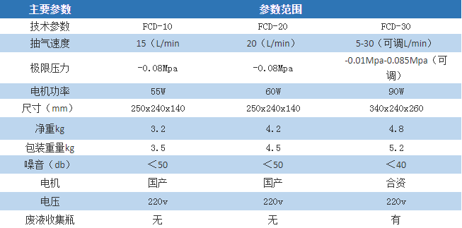 特点9br/> 1、结构紧凑合理、体积小、真空度高、噪音低、br/> 2、该泵配合过滤瓶、多联过滤器及固相萃取装置使用,都会达到理想的抽气效果、br/> 3、适用于抽吸各种液体和给容器减压抽真空,真正是实验室吸液和抽真空的理想负压设备、br/> 4、根据操作者的需要,可以与溶剂过滤器,固相萃取装置等设备相匹配使用、br/>FCD-10无油真空泵是提高过滤效率,加强脱气效果的重要过滤配套设备。为保障过滤介质不被污染,一般均使用无油隔膜式真空泵,此类泵型是通过橡胶膜片的往返运动形成真空,其真空压力一般为0.08Mpa左右(单级),提高过滤速度关键是单位时间内的排气量,及真空泵的流量指标,在过滤量大、介质粘度高时颗粒堵塞滤膜情况下尤显突出、br/>