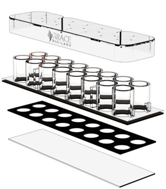 盖玻片上的腔室共16个,?排,?孔(如图示),每孔的内直?mm。设计的每孔体积和孔距与标准96孔板的相同,无细胞毒性的硅胶孔垫片(silicone well gasket)与上层聚苯乙烯材料的腔室(the upper structure,厚0.5mm)和基层的硼硅酸盐盖玻片(the substructure,厚0.16-.19mm)形成滴水不漏的密封。有上层腔室时每孔体?50?l,去掉上层腔室后每孔体积9?l、/p>