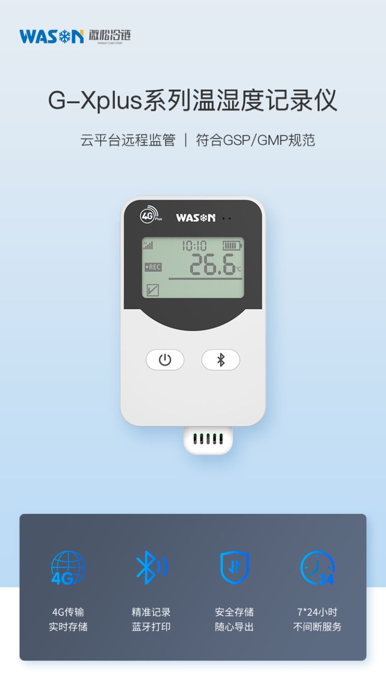微松G-Xplus系列温湿度记录仪是一?G传输的网络型智能仪表,符合GSP/GMP规范。可实现远程温湿度监测、实时定位、蓝牙打印、超限报警、开关门报警等功能,同时具有**的续航能力。通过冷链汇云平台可实现记录仪参数远程设置、历史数据和位置轨迹查询。广泛应用于医药冷链、食品生鲜等行业,可配合保温箱嵌入使用、/p>