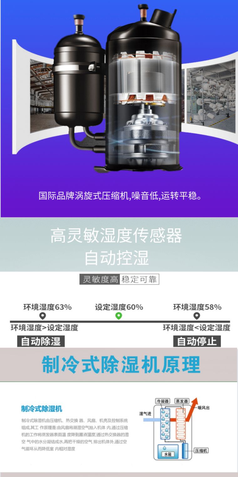 产品特点9/strong> 钢结构形式,刚度、强度更高,牢固耐用 整机结构紧凑,外形美观,操作维护方便 电子式温控化霜功能,低温环境可正常运衋/p> 合理利用冷凝废热加热被处理空气,节能环保 底角万向轮,可随时移动到特定场合,机动灵洺/p> 环境湿度数码显示,特有湿度选择和自动控制功胼/p> 国际**柔性涡旋压缩机,高效率、高可靠性、运行宁靘/p> **外转子低噪音离心式送风机,体积小、效率高、噪音低、运转平稲/p> 技术参数: