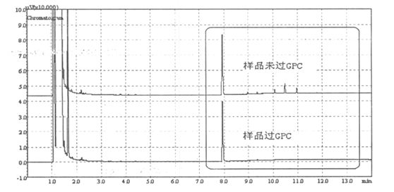 而糖类由于流出时间与脱氢乙酸的接近,因此洗脱液还是含有部分糖类,由于存在糖类造成进样针进样时不易清洗易堵塞,因此提取液在进GPC 前用100mL10% 氯化钠溶液洗涤,可以达到清除糖类作用。此净化处理效果很好,同时对色谱柱也有很好保护。下图是未经过GPC净化和经过GPC净化的对比图。