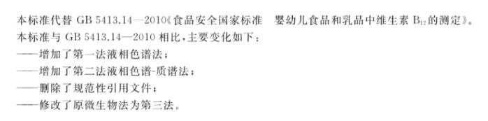 与GB 5413.14-2010相比,新国标中新增了“液相色谱法”和“液相色谱-质谱法”作为食品中维生素B12检测的新方法;原“微生物法”为第三法。
