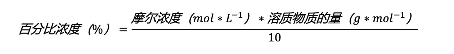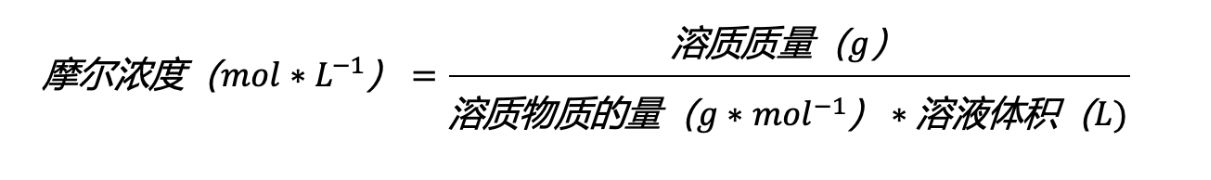 摩尔浓度(物质的量浓度)定义为溶液中溶质物质的量除以溶液(混合物)的体积,单位M=mol×L-1。采用如下公式可根据摩尔浓度稀释溶液: