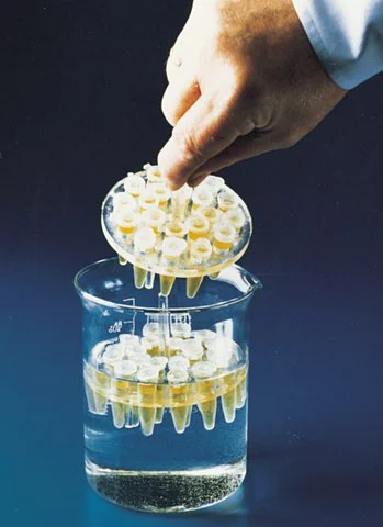 Even when fully loaded, tubes are completely immersed while tops rest above the rack, floating in a beaker of water. Perfect for use in benchtop incubation. The rack is easily unloaded by lightly pressing it down against the bench until the legs touch, releasing the tubes. Molded of steam autoclavable polypropylene, the racks fit 400 mL or 1000 mL beakers. 1.5 mL microtubes will fit the 10.8 mm holes and 0.5 mL tubes fit the 7.7 mm holes. Racks are 6.4 mm (? in.) thick with 19 mm (? in.) long legs and a center handle.