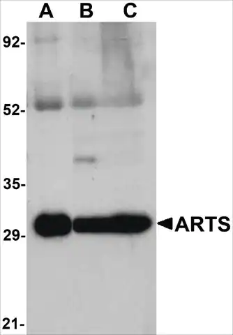 | Immunogen【免疫原】 | ARTS antibody was raised against a synthetic peptide corresponding to amino acids near the amino terminus of human ARTS. |