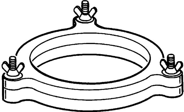Two-piece, black anodized aluminum clamp has three wing nuts to secure Ace reaction flask to head. Clamps also fit Pyrex reaction kettles.