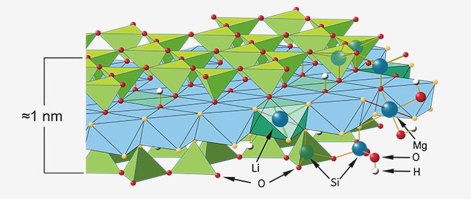 锂皂石为人工合成的含锂、镁、硅的层状硅酸盐粘土类物质。其结构由两层硅氧四面体夹一层镁氧八面体构成,在镁氧八面体中一部分Mg2+被Li+置换,形成[Si8(Mg5.34Li0.66)O20(OH)4]Na0.66的结构式。