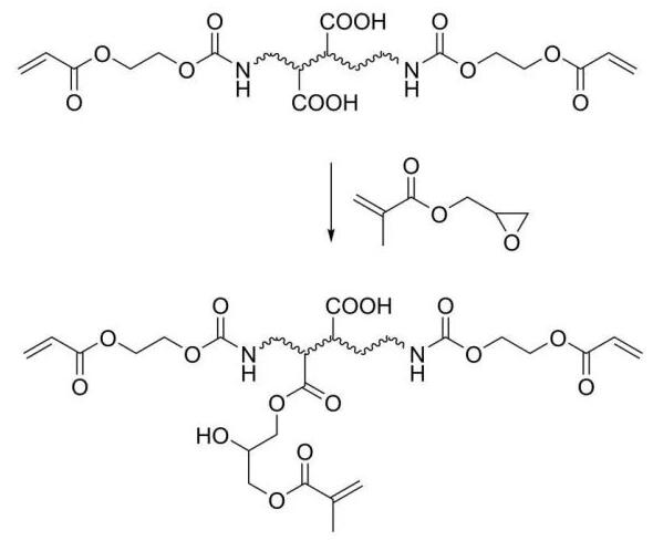 GMA可以通过多种合成路线用于UV光固化树脂合成。一种方法是首先通过自由基聚合或缩合聚合,得到在侧链上含有羧基或氨基的预聚体,然后再用GMA和这些官能基反应,引入感光基团从而得到光固化树脂。在第一步共聚时,可以采用不同的共聚单体,从而得到最终性能各异的聚合物。冯宗财等人采用1,2,4-偏苯三酸酐和乙二醇反应合成超支化聚合物,再通过GMA引入感光基团,最终得到较好碱溶性的光固化树脂。陆挺峰等人采用以聚己二酸-1,4-丁二醇酯、甲苯二异氰酸酯、二羟甲基丙酸和丙烯酸羟乙酯先合成具有感光活性双键的预聚物,再通过GMA引入更多的可光固化双键,经三乙胺中和,得到水性聚氨酯丙烯酸酯乳液。