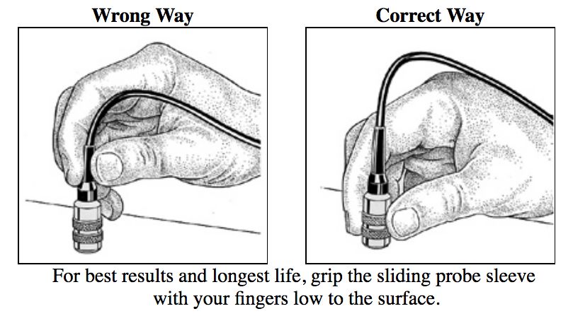 热和粗糙表面对涂层厚度探头最有害。最长的寿命,避免长时间暴露在热的表面,让探头在测量之间冷却。小心地放下探头,不要拖到一边,尊重粗糙的表面。已知厚度的塑料垫片可以放置到这些表面起保护的探讨。该量规将测量总垫片+涂层厚度,但垫片厚度可从测量厚度中减去。注意使用垫片产生的额外测量公差。