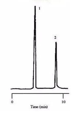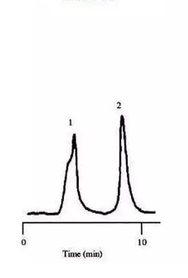 上图中,色谱图上较早洗脱的峰扭曲变形或者开叉,与此同时较晚洗脱的峰则较为尖锐与对称,这些现象显示一个比较特殊的起因――样品溶液的溶剂很可能强于流动相。此种强溶剂效应的例子在左图中可见。此处的样 品溶液的溶剂是100%乙腈(100%的强溶剂),而流动相的组成则较弱,18%的乙腈与72%的水。第一个峰是开叉的,并且与第二个峰相比,明显地变宽 了。当样品溶液的溶剂变成流动相时,所有的峰形都改善了,且变得尖锐。见右图。