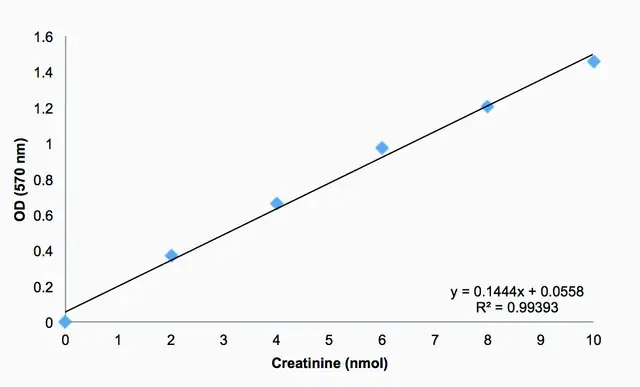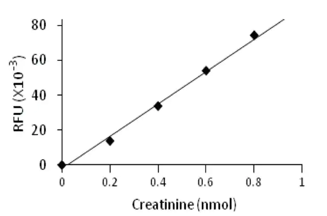 在此分析中,肌酸酐浓度是由偶联酶反应确定,生成的比色(570nm)/荧光(λex = 535em/λ = 587 nm)产物和肌酸酐成正比。