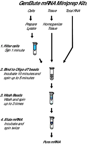 | General description【一般描述】 | GenElute™ Direct mRNA小量制备试剂盒可以方便的从哺乳动物细胞和组织中直接分离多腺苷酸化mRNA。mRNA直接分离方法基于Badley原理。通过随附的滤柱或机械式均质器,可以裂解并均质化多达107哺乳动物细胞或40 mg组织。 .经过10 分钟的蛋白酶K消化步骤,RNase被去除掉。之后加入氯化钠,经过10分钟的孵育,多腺苷酸化RNA被捕获到oligo(dT) 聚苯乙烯微珠上。如需需进一步富集,可将RNA从微珠上解离到新鲜的裂解溶液中,然后重新采用原来的微珠进行捕获。过柱洗涤3次后,用100 μl的Tris-HCl(10 mM,pH 7.4)溶解纯化后的mRNA。 |
