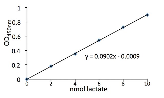 乳酸盐浓度通过偶联酶测定法进行测定,其能够产生与样品中存在的乳酸盐成比例的比色(450nm)产物。不需要预处理或纯化样品。典型的检测灵敏度为0.02-10mM乳酸盐。