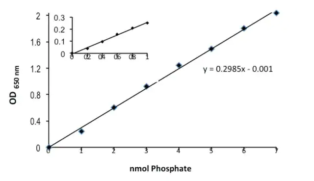 磷酸盐比色法测定试剂盒为测定多种样本中的磷酸盐提供了一种简单直接的程序。 磷酸盐与显色复合物反应,生成与磷酸盐含量成比例的比色产物 (650 nm)。 磷酸盐浓度在 1 μM 至 1 mM 之间,检测下限为 0.1 nmol,可直接测定。