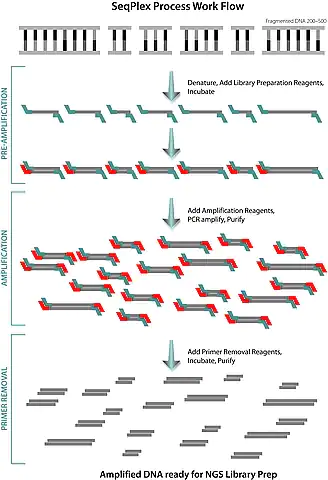 ?Enhanced DNA Amplification Kit for whole genome amplification (WGA) is designed to facilitate next-generation sequencing (NGS) from extremely small quantities or from degraded/highly fragmented DNA. The yields from chromatin immunoprecipitation (ChIP) or formalin-fixed paraffin-embedded tissue samples (FFPE) are often less than required for successful next generation sequencing library preparation. The SeqPlex kit allows the user to pre-amplify these and other small quantity/highly fragmented DNA samples for input into a NGS workflow. This kit is an extension of the WGA product line and has been developed to integrate into the Illumina
