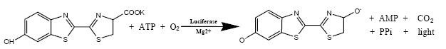 D-虫荧光素(D-Luciferin)是萤火虫荧光素酶底物,其量子效率为0.88,是Luminol的20倍。反应原理:首先,在镁离子存在下荧光素酶使荧光素与ATP反应,接着它被氧化形成二氧杂环丁烷结构并发出黄绿色的光。Luciferin-luciferase发光用于ATP监控以测定细胞活力以及细菌计数。它还用于报告基因检测。可与小动物活体成像系统配套使用,用于标记LUC基因后的体内活体荧光检测。