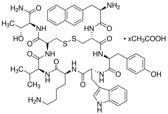 | 产品别名: | Angiopeptin acetate BIM-23014C 3-(2-Naphthalenyl)-D-alanyl-L-cysteinyl-L-tyrosyl-D-tryptophyl-L-lysyl-L-valyl-L-cysteinyl-L-threoninamide cyclic (2?)-disulfide acetate |