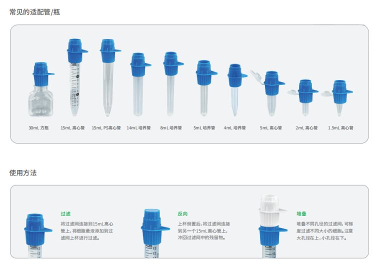 不同目径 的过滤网可叠放使用,一步完成梯度过滣/p>