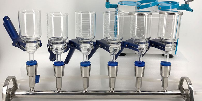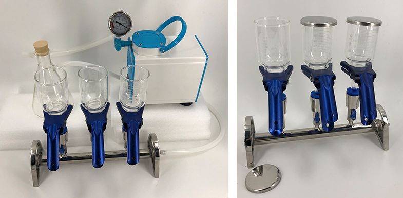 多联过滤器是实验室中的容积过滤装置,与玻璃材质砂芯过滤装置相对比,多联过滤器更高效,更快捷,仅需一台泵就可同时过滤多个样品,提高了实验室工作效率、br/>产品特点9br/> 1.过滤器主架和阀门不锈钢材料制造,经久耐用、br/> 2.滤杯为玻璃材料,透明度高,耐高温消毒、br/> 3.每个样品配单独阀门控制,可单独过滤一个样品,亦可同时过滤多个样品、br/> 4.适合微生物检测,菌落检查和液体中微粒的测定等、br/> 5.过滤器上过滤杯与过滤头之间夹子连接,操作简单快捷、br/>产品规格9br/>?nbsp; ?nbsp; 数:DC-3*300ml 3 / DC-6*300ml 6夳br/> 质:过滤器主架和阀门为SUS304不锈钢或SUS316不锈钢,滤杯为玻璃材斘br/>滤杯容积?00ml?nbsp; 圈:硅橡胵br/>?nbsp; 菌:121?0分钟热压消毒可选配置:无油真空泵,集液瓶、br/>