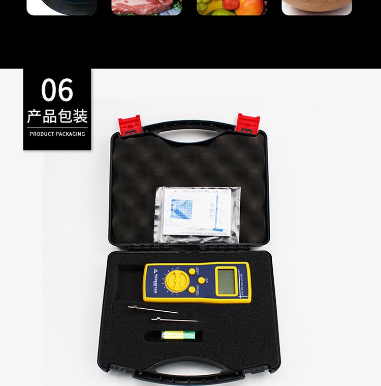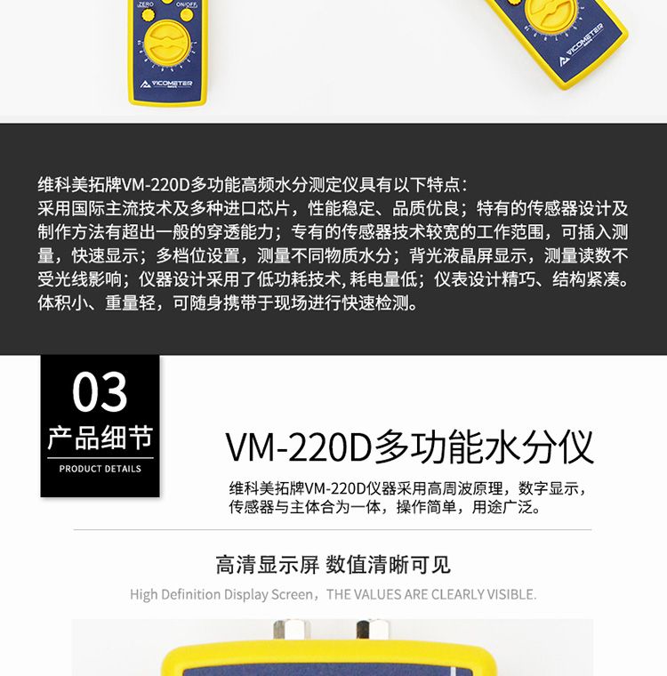维科美拓牌VM-220D多功能高频水分测定仪具有以下特点9/p> 1、采用国际主流技术及多种进口芯片,性能稳定、品质优良、/p> 2、特有的传感器设计及制作方法有超出一般的穿透能力、/p> 3、专有的传感器技术较宽的工作范围,可插入测量,快速显示、/p> 4、多档位设置,测量不同物质水分、/p> 5、背光液晶屏显示,测量读数不受光线影响、/p> 6、仪器设计采用了低功耗技? 耗电量低、/p> 7、仪表设计精巧、结构紧凑、/p> 8、体积小、重量轻,可随身携带于现场进行快速检测,是现场检测人员检测水分含量的好帮手、/p>