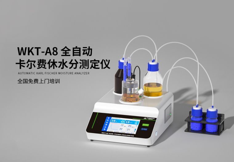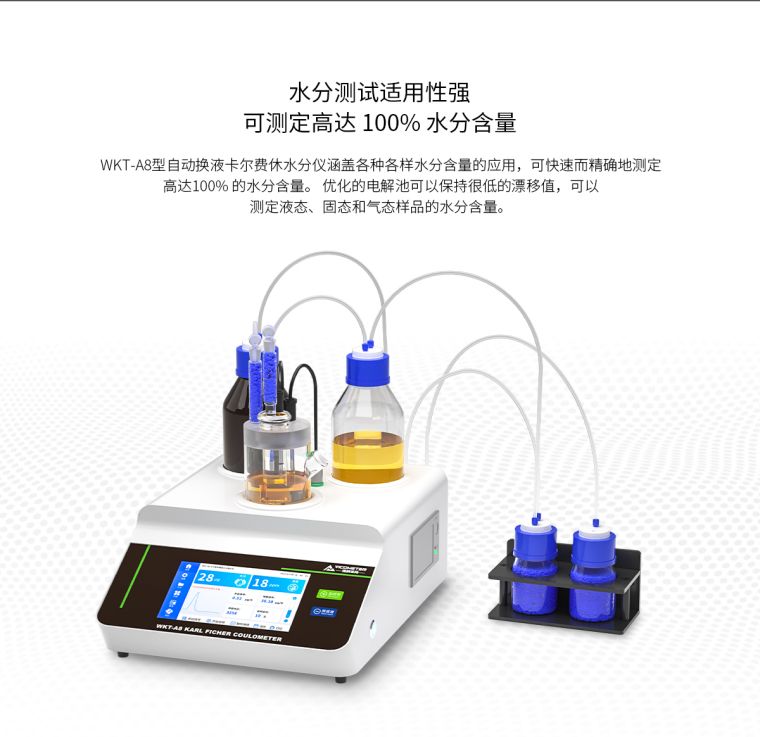 WKT-A8"全自?卡尔费休微量水分测定仪利用的是卡尔费休库仑法(电量法)的原理去快速测定样品中的微量水分,测定水分低至1ppm?.0001%),可以?分钟内测定出固体、液体、粉体的微量水分,仪器自带打印功能,可以储存600组数据,可实时查询并打印!WKT-A8型全自动卡尔费休微量水分测定?**特点是可以实现自动加试剂和自动排废液,可以避免操作人员与反应试剂直接接触,也可以避免试剂的挥发性成分对人体造成的影响,仪器符合多项国家及国际水分测定标准,内置四种水分计算公式,能够适用各行业水分测定需要,广泛应用在化工、石油、医药、电力、食品、科研、检测等行业、/p>