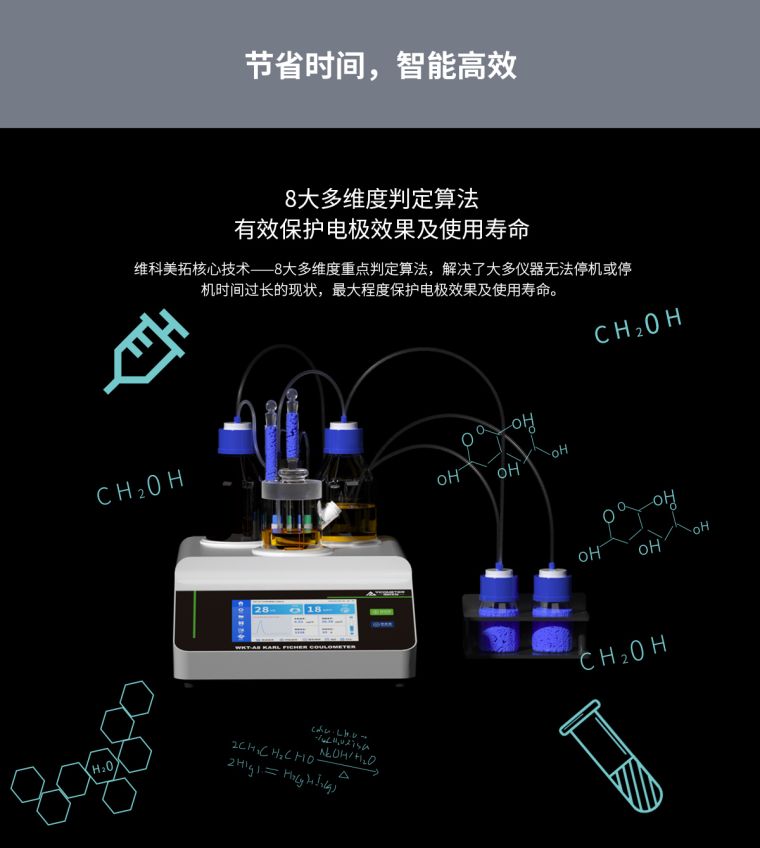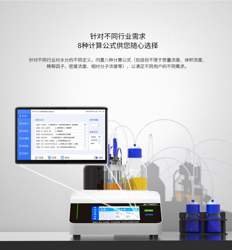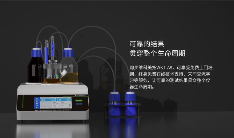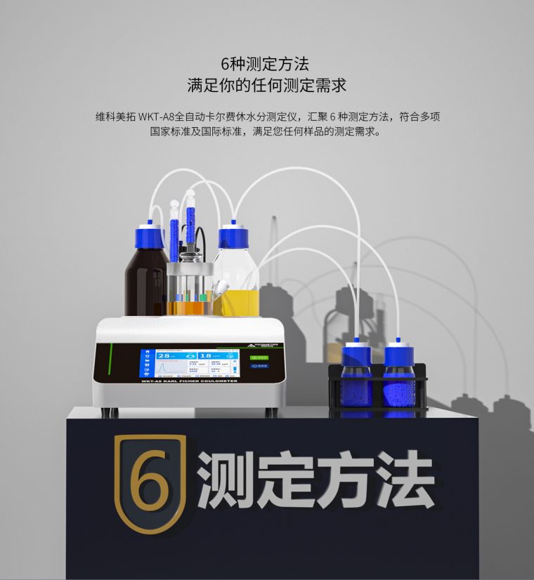 WKT-A8"全自?卡尔费休微量水分测定仪利用的是卡尔费休库仑法(电量法)的原理去快速测定样品中的微量水分,测定水分低至1ppm?.0001%),可以?分钟内测定出固体、液体、粉体的微量水分,仪器自带打印功能,可以储存600组数据,可实时查询并打印?br />