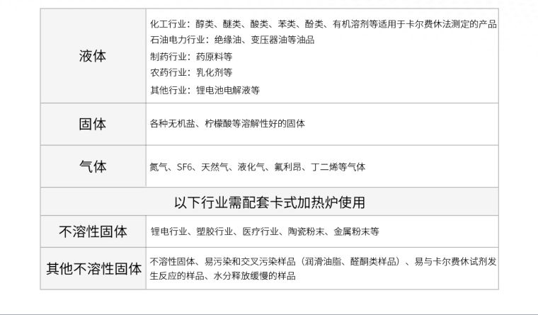不溶性固体、易污染和交叉污染样品(润滑油脂、醛酮类样品)、易与卡尔费休试剂发生反应的样品、水分释放缓慢的样品 |