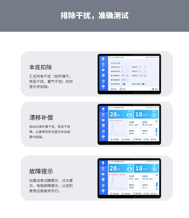 自动漂移补偿、环境及本底水分自动扣除、故障自检提示 |