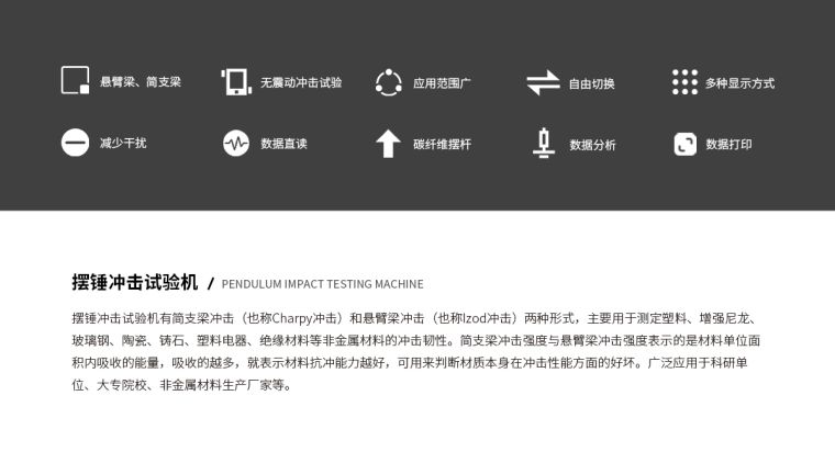 产品特点 应用范围幾/p> WKT-XJ6001型触摸屏悬简组合式冲击试验机用于测定塑料、增强尼龙、玻璃钢、陶瓷、铸石、塑料电器、绝缘材料等非金属材料的冲击韧性。广泛应用于科研单位、大专院校、非金属材料生产厂家等、/p> 数据直读 采用高精度智能控制系统,并配备高清晰大屏液晶显示屏,让用户能够直观、准确的读取测试数据、/p> 多种显示方式 可选择中文/英文操作界面,方便国际友人操作,自由选择J/m、KJ/㎡、kg-cm/cm、ft-ib/in等多种单位显示模式、/p> 数据打印 内置微型打印机,可对试验结果进行打印存档,方便日常管理分析,为生产的平稳运行提供数据支持、/p> 无震动冲击试骋/p> 采用碳纤维摆杆,在冲击方向上,提高材料的刚性,以及将冲击质量最大集中在摆锤的质心上,真正做到无震动冲击试验,且使用寿命更长、/p> 减少干扰 符合空气动力学原理的冲击锤和进口滚珠轴承,极大的减少了机械带来的摩擦损耗;进口高分辨率的数字编码器,角度测试精度更高、更稳定;空载试验空白校准,能量损失自动修正,消除环境因素对测试结果的影响、/p> 数据处理系统 强大的数据处理系统,自动计算最终试验结果,可保?4组试验数据,并经过系统分析后自动计算出平均值,排除偶然误差,让测试结果更加合理、权威、/p>