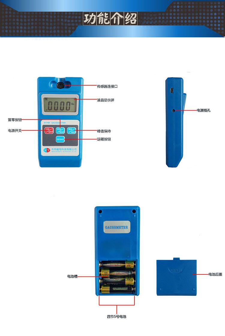 主要技术指标: 量程范围:0~1.9999Gs 基本误差:±2% 分辨率:0.0001Gs(即等于0.1mGs) 被测磁场:直流磁场 环境温度:5~40℃ 相对湿度:20%~80%(无凝露) 供电电源:四节5号电池;外接5V稳压电源 外型尺寸:150mm(L)×70mm(w)×30mm(H) 半岛游戏平台官网入口网址 重量:300g 显示方式:4 1/2 LCD 显示单位:Gs