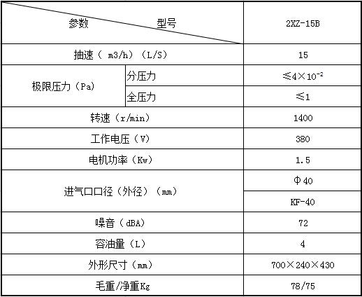 2XZ-15B直联旋片真空泵是适用于抽吸空气及其它一般性气体。采用油泵强制进油装置,在进气口压强?.33×103时,仍可连续运转的优点。它可单独使用,也可用于增压泵、扩散泵、分子泵的前级泵、维持泵、钛泵的预抽泵用,广泛适用于真空冶金、真空镀膜、真空干燥、冷冻干燥、真空脱气、真空包装、真空吸附、真空成形、食品包装、印刷、溅射、真空铸造、光伏、航空科技领域、化工、电子、冰箱、空调流水线特点和实验室等真空作业以及配套使用、/span> 2XZ-15B直联旋片真空泵特点: 1、配制特殊设计气镇阀,防止泵油混水,延长泵油的使用时间; 2、抽气效率高、极限真空高、使用寿命长:/p> 3、设有自动防返油止回阀,永不返油; 3、专配真空干燥箱、冻干机、印刷机械、镀膜机、手套箱、刻蚀机、冰箱流水线等; 4、可配小口径转换接头、KF接口、法兰接口; 5、当抽吸含有蒸气、颗粒、腐蚀性气体,在泵的进气口须安装辅助设备,如冷凝器、除尘器等、/p> 2XZ-15B直联旋片真空泵展礹/strong>