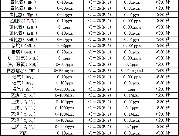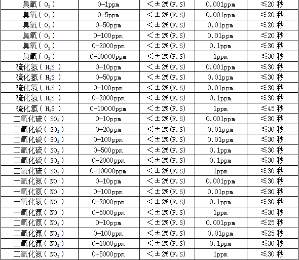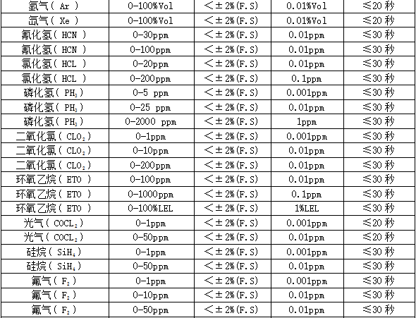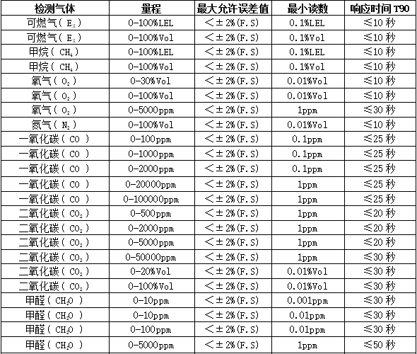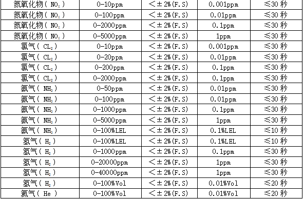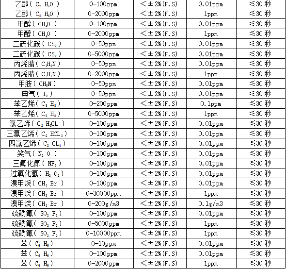 PTM600检测仪技术参数: 检测气体:DOAS 应用场合:石油、化工、医药、环保、燃气配送、仓储、烟气分析、空气治理等所有需要便携式快速检测气体浓度的场合、/p> 检测范围:0-50?00?00?000?000?000ppm、其它量程可定制 率:0.01ppm?.001ppm(0?0 ppm);0.01ppm(0?00 ppm)?.1ppm(0?000 ppm)?ppm(0?000 ppm以上)?.01毫克/?0?00%毫克/??.1%LEL?.01%?.001%Vol 检测原理:同时检测并区分NO、NO2、SO2、NOX等,不能同时测高浓度和低浓度,不受水汽影哌/p> 允许误差:≤2%F.S (其他或更高精度可订制) 度:?#177;2% 响应时间:T90?0秒重 性:?#177;2%不确定度:≤2% 工作环境:温度:-40℃~+70℃,湿度:≤10?5%RH,内置过滤器可在高湿度或高粉尘环境使用恢复时间:?0科/p> 样气温度?40℃~+70 ,选配高温采样降温过滤手柄,最高可检?300度的烟气浓度 温湿度测量:选配:温?40℃~+70℃,精度0.5ℂ湿度0?00%RH,精?%RH 工作电源?.7VDC?400mAh2大容量可充电高分子聚合物电池 显示方式?.5寸高清彩屎/p> 检测方式:内置泵吸式测量,流量800毫升/分钟。标定流量要大于800毫升/分钟,要接三通管进行分流,保证有多余的气体从旁路排出 报警方式:声光报警、关闭报警可讽/p> 通讯接口:USB(充电与通讯),选配:RS232、红外通讯,自动识?/p> 数据存储:大容量数据存储,支持扩容、/p> 防护等级:IP66 防爆类型:本质安全型 防爆标志:Ex ia IIC T4 Ga 防爆证号:CNEx16.3091 执行标准:GB 15322.3-2019《测量范围为0-100%LEL的便携式可燃气体传感器《/p> GB 3836.1?010 《爆炸性气体环境用电气设备 通用要求《/p> GB 3836.4?010 《爆炸性气体环境用电气设备 本质安全型“i”《/p> 外型尺寸?55210125mm(LHW) 定制:420210125mm(LHW) 量:2.5Kg 标准附件:说明书、合格证、保修卡、USB充电?含数据线)、高档铝合金仪器 、内置湿度粉尘过滤器 ?0cm不锈钢采样手?1米软管,带粉尘过滤器,不可伸? 选配项:温湿度测量功能?.2 m 可伸缩采样手?1-10米软管,标准长度1?、外置远距离采样泵、高温采样降温过滤手柄、高温高湿预处理系统、光?上位机通讯软件)、外置微型无线蓝牙打印机、内置微型打印机、SD卡存储、U盘存储、无线数据通讯 部分可检测气体列表:
